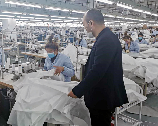 為了生產(chǎn)順利進(jìn)行,徐亞東首先梳理出哪些員工符合上崗要求,做好溝通,動員返廠。復(fù)工后徐亞東與職工并肩作戰(zhàn),每天穿梭在生產(chǎn)車間,協(xié)調(diào)組織防護(hù)服生產(chǎn),一直沒有停下忙碌的腳步,加班也成為他的工作常態(tài)。