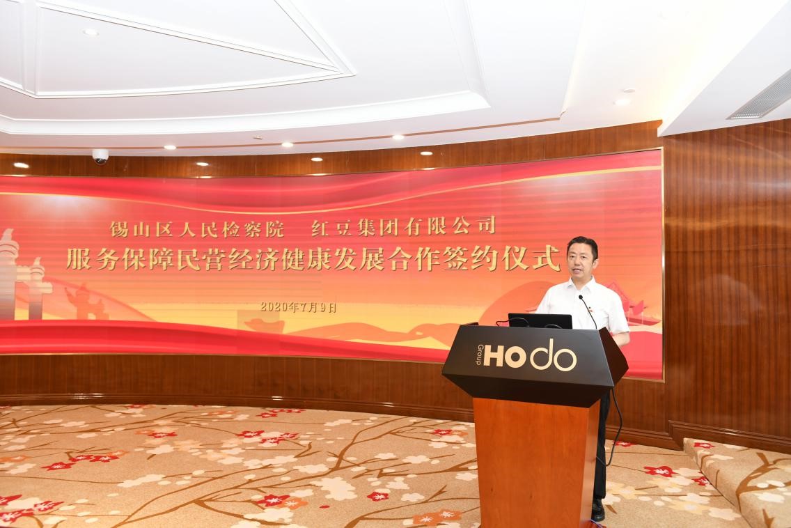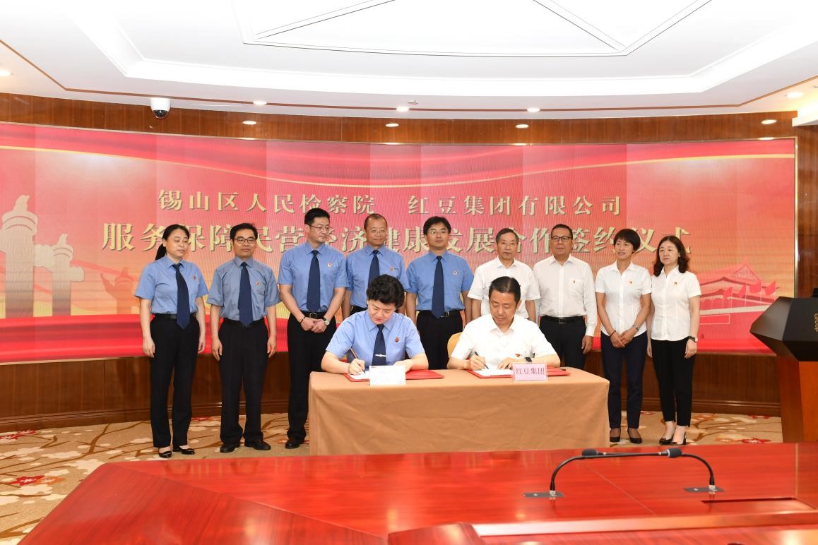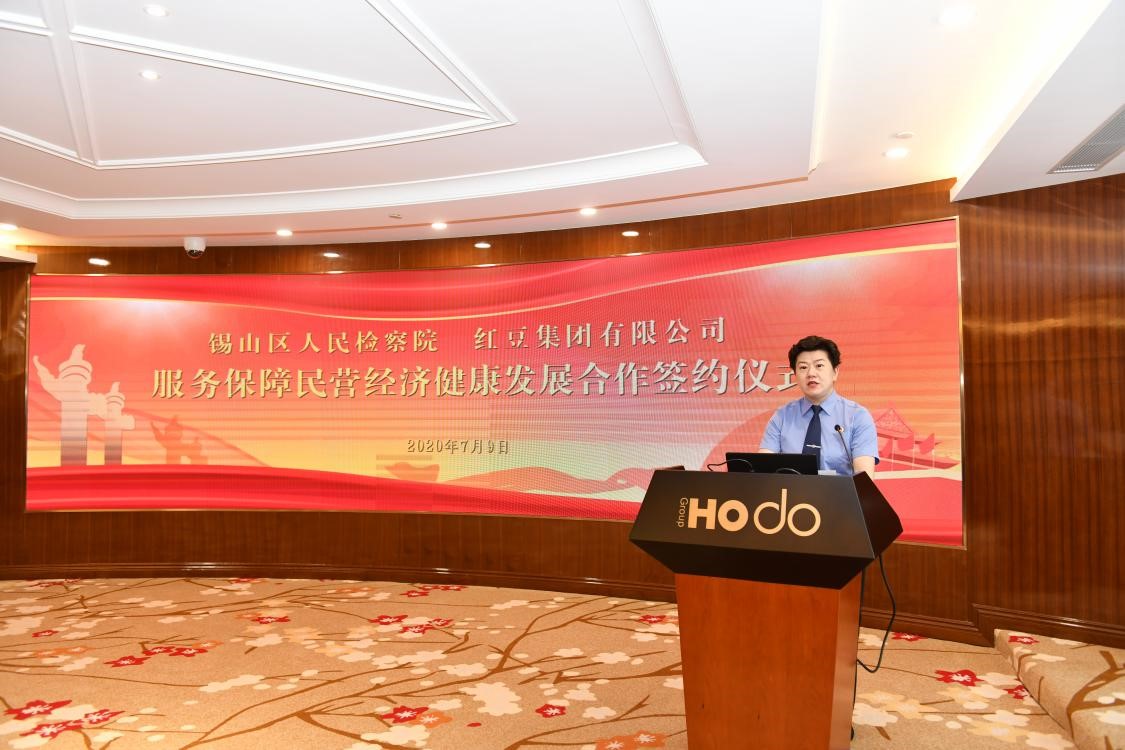 為深入貫徹習(xí)近平總書記在民營企業(yè)座談會上的重要講話精神,落實(shí)中央、省市委關(guān)于大力支持民營經(jīng)濟(jì)發(fā)展部署要求,充分發(fā)揮檢察機(jī)關(guān)職能,為民營經(jīng)濟(jì)提供優(yōu)質(zhì)的法律服務(wù)和堅定的司法保障,7月9日,紅豆集團(tuán)與錫山區(qū)人民檢察院在紅豆財富廣場北京廳進(jìn)行服務(wù)保障民營企業(yè)健康發(fā)展合作備忘錄簽約。儀式上,紅豆集團(tuán)黨委書記、董事局主席兼CEO周海江和錫山區(qū)人民檢察院何瑩檢察長代表雙方簽署合約。